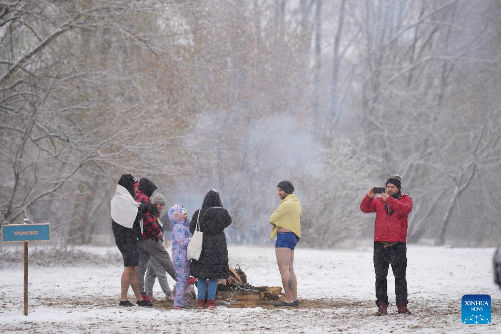 Winter swimmers warm up by a bonfire on the snowy banks of the Vistula River in Warsaw, Poland, on Nov. 23, 2025. Sunday marked the opening of the cold-water swimming season in Warsaw. (Photo by Jaap Arriens/Xinhua)