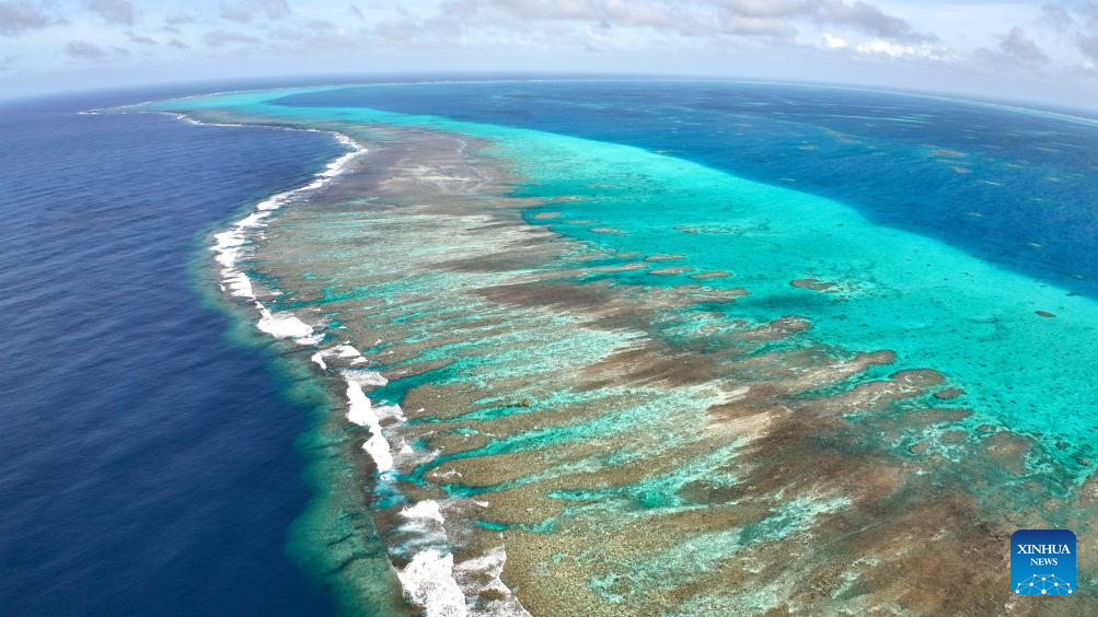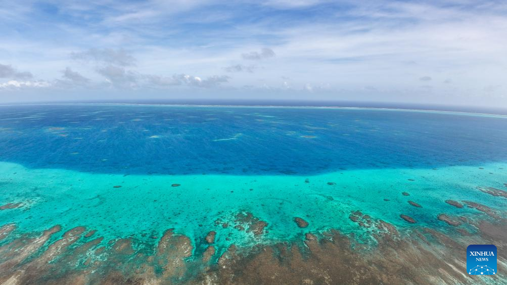 An aerial drone photo taken on Nov. 8, 2025 shows reefs at China's Huangyan Dao national nature reserve in the South China Sea. (Xinhua/Bei He)