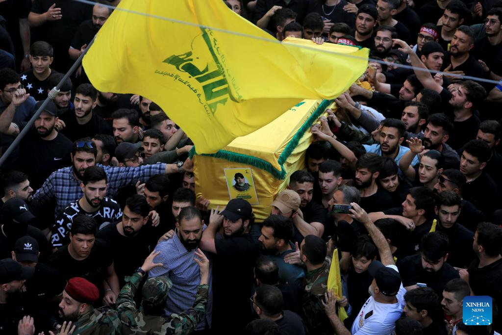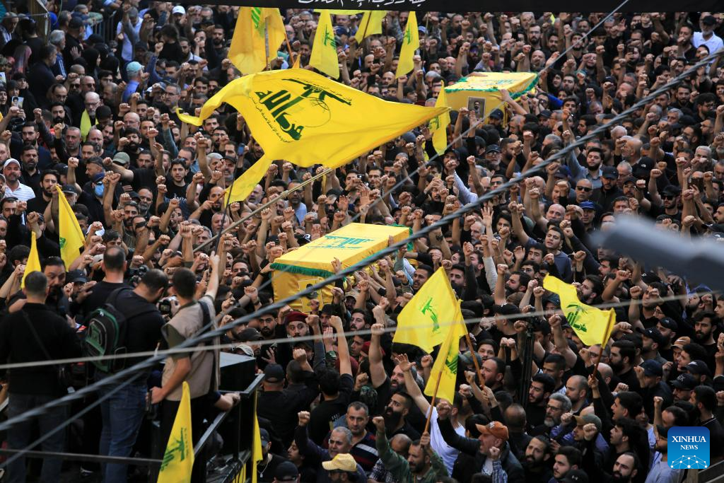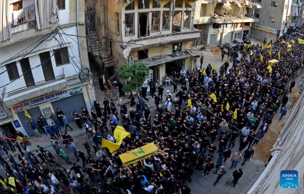 People attend a funeral of victims killed in an Israeli airstrike in Beirut's southern suburbs, Lebanon, Nov. 24, 2025. An Israeli airstrike on Beirut's southern suburbs killed senior Hezbollah commander Haytham Ali Al-Tabtabi on Nov. 23, the Israeli military and the Lebanese group said, a high-profile assassination that further strains a year-old ceasefire.