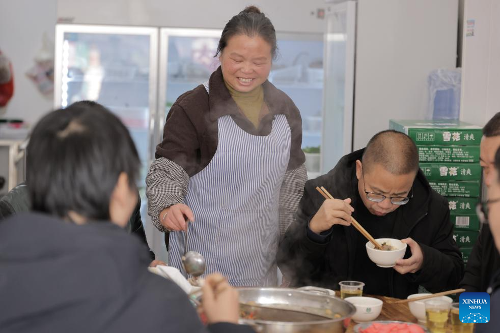 A resident (C) serves customers at her restaurant in Huajiang Town of Guanling Bouyei-Miao Autonomous County, southwest China's Guizhou Province, Nov. 5, 2025. The Huajiang Grand Canyon Bridge, soaring 625 meters above the Beipan River in Guizhou's mountainous terrain, is the world's highest bridge. The mega-project is also helping boost tourism in the nearby Huajiang Town, which has benefited from the improved traffic condition. (Xinhua/Ou Dongqu)