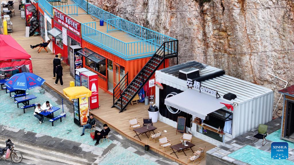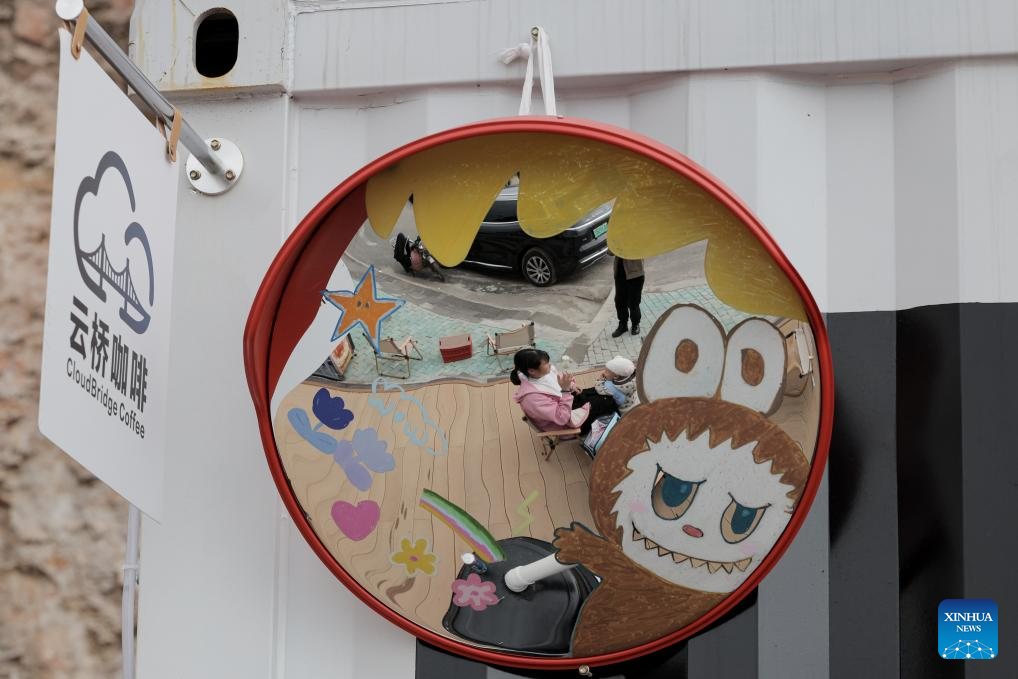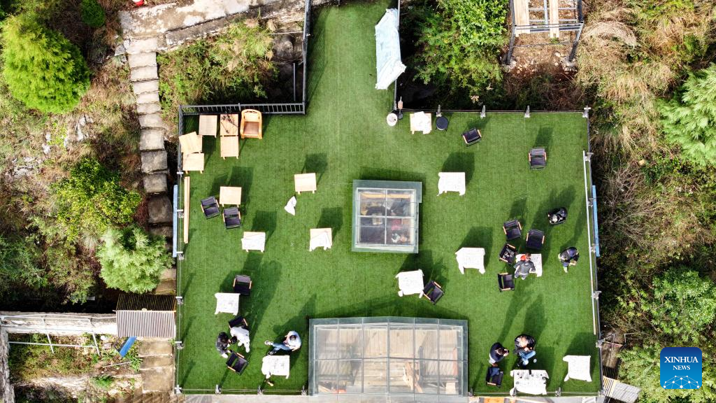 Tourists take a rest at a coffee shop at Huanjiang Town of Guanling Bouyei-Miao Autonomous County, southwest China's Guizhou Province, Nov. 5, 2025. The Huajiang Grand Canyon Bridge, soaring 625 meters above the Beipan River in Guizhou's mountainous terrain, is the world's highest bridge. The mega-project is also helping boost tourism in the nearby Huajiang Town, which has benefited from the improved traffic condition. (Xinhua/Ou Dongqu)