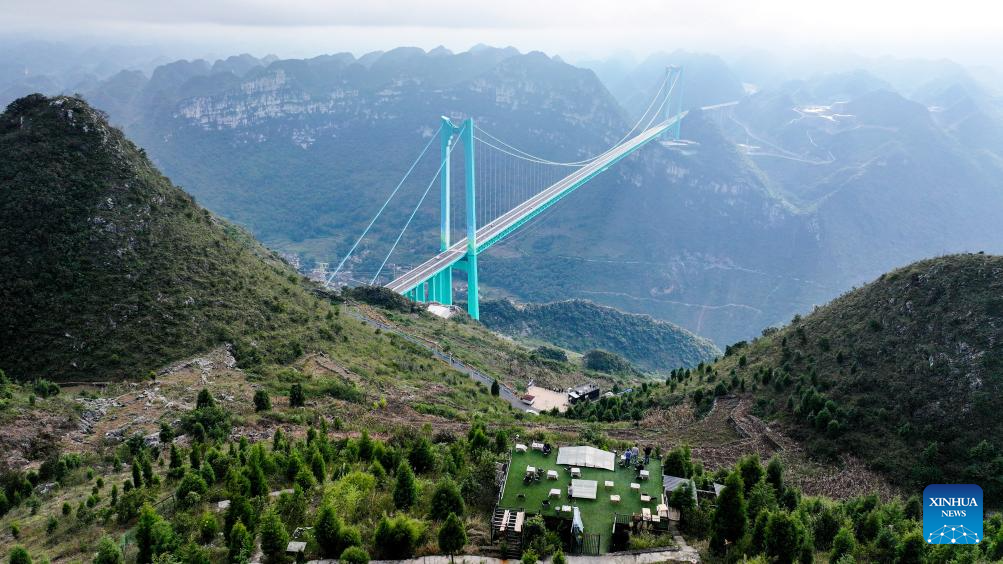An aerial drone photo taken on Nov. 5, 2025 shows the Huajiang Grand Canyon Bridge and a coffee shop in Huajiang Town in Guanling Bouyei-Miao Autonomous County, southwest China's Guizhou Province. The Huajiang Grand Canyon Bridge, soaring 625 meters above the Beipan River in Guizhou's mountainous terrain, is the world's highest bridge. The mega-project is also helping boost tourism in the nearby Huajiang Town, which has benefited from the improved traffic condition. (Xinhua/Ou Dongqu)