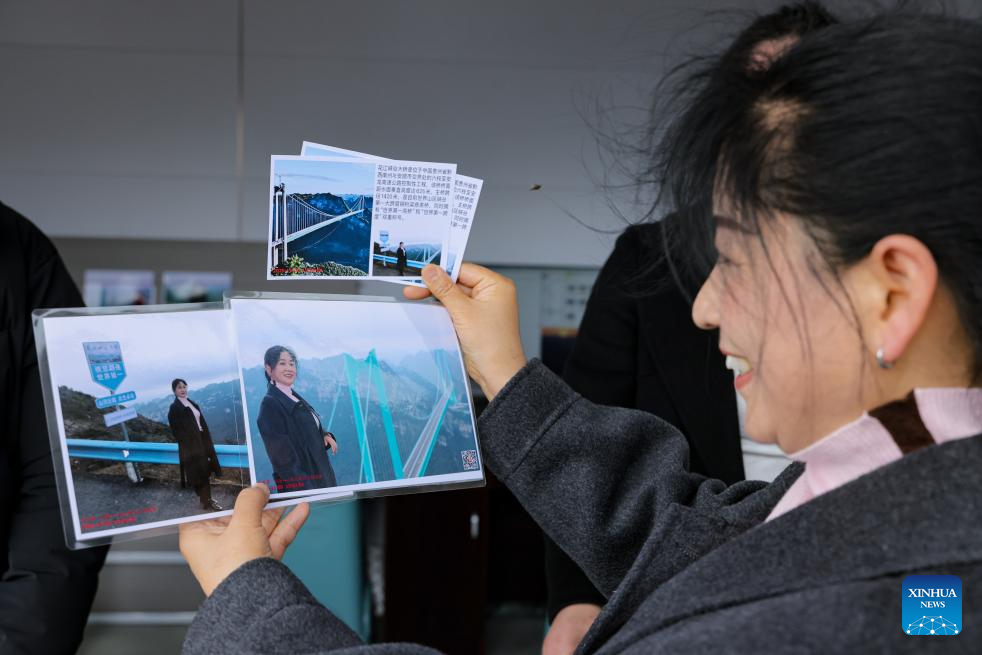 A tourist selects photos of her at a village photo studio in Huajiang Town in Guanling Bouyei-Miao Autonomous County, southwest China's Guizhou Province, Nov. 5, 2025. The Huajiang Grand Canyon Bridge, soaring 625 meters above the Beipan River in Guizhou's mountainous terrain, is the world's highest bridge. The mega-project is also helping boost tourism in the nearby Huajiang Town, which has benefited from the improved traffic condition. (Xinhua/Ou Dongqu)