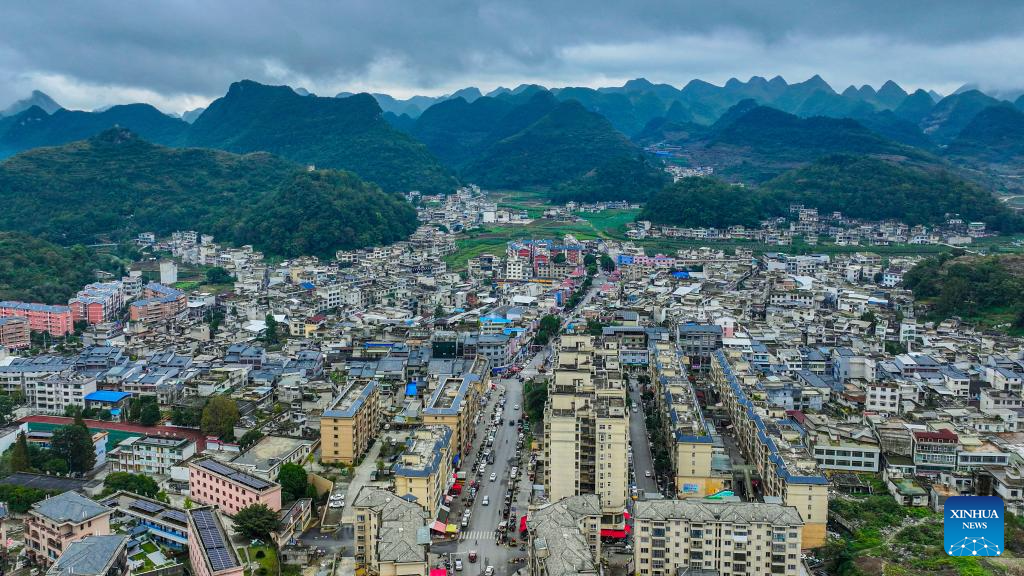 An aerial drone photo shows a view of Huangjiang Town in Guanling Bouyei-Miao Autonomous County, southwest China's Guizhou Province, Nov. 5, 2025. The Huajiang Grand Canyon Bridge, soaring 625 meters above the Beipan River in Guizhou's mountainous terrain, is the world's highest bridge. The mega-project is also helping boost tourism in the nearby Huajiang Town, which has benefited from the improved traffic condition. (Xinhua/Ou Dongqu)