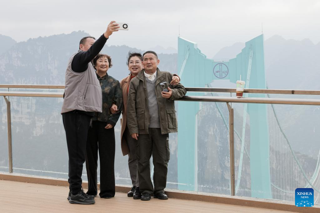 Tourists take selfies with the Huajiang Grand Canyon Bridge in Huajiang Town of Guanling Bouyei-Miao Autonomous County, southwest China's Guizhou Province, Nov. 5, 2025. The Huajiang Grand Canyon Bridge, soaring 625 meters above the Beipan River in Guizhou's mountainous terrain, is the world's highest bridge. The mega-project is also helping boost tourism in the nearby Huajiang Town, which has benefited from the improved traffic condition. (Xinhua/Ou Dongqu)