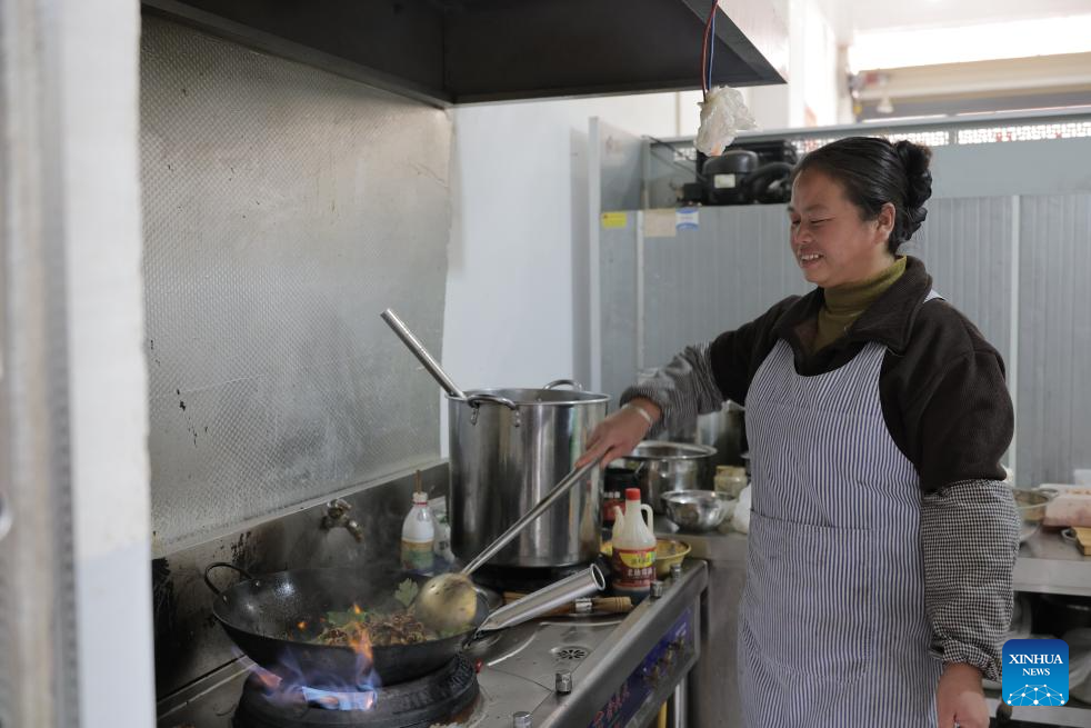 A resident cooks at her restaurant in Huajiang Town of Guanling Bouyei-Miao Autonomous County, southwest China's Guizhou Province, Nov. 5, 2025. The Huajiang Grand Canyon Bridge, soaring 625 meters above the Beipan River in Guizhou's mountainous terrain, is the world's highest bridge. The mega-project is also helping boost tourism in the nearby Huajiang Town, which has benefited from the improved traffic condition. (Xinhua/Ou Dongqu)