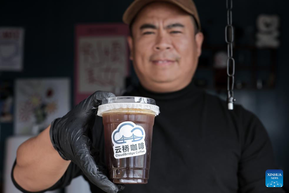 A coffee shop owner displays a cup of coffee in Huajiang Town in Guanling Bouyei-Miao Autonomous County, southwest China's Guizhou Province, Nov. 5, 2025. The Huajiang Grand Canyon Bridge, soaring 625 meters above the Beipan River in Guizhou's mountainous terrain, is the world's highest bridge. The mega-project is also helping boost tourism in the nearby Huajiang Town, which has benefited from the improved traffic condition. (Xinhua/Ou Dongqu)