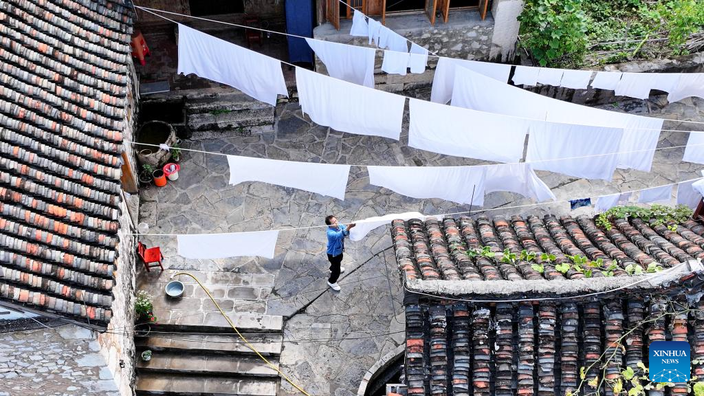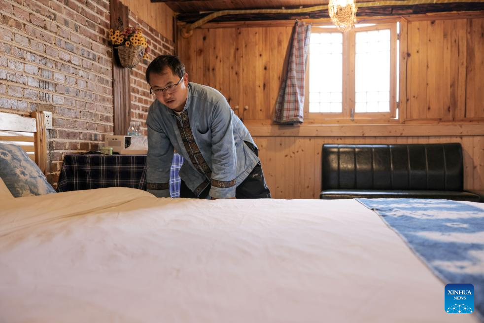 An owner of a homestay tidies up a room at Pingjie Town of Bouyei-Miao Autonomous Prefecture of Qianxinan, southwest China's Guizhou Province, Nov. 6, 2025. The Huajiang Grand Canyon Bridge, soaring 625 meters above the Beipan River in Guizhou's mountainous terrain, is the world's highest bridge. The mega-project is also helping boost tourism in the nearby Pingjie Town, which has benefited from the improved traffic condition. (Xinhua/Ou Dongqu)