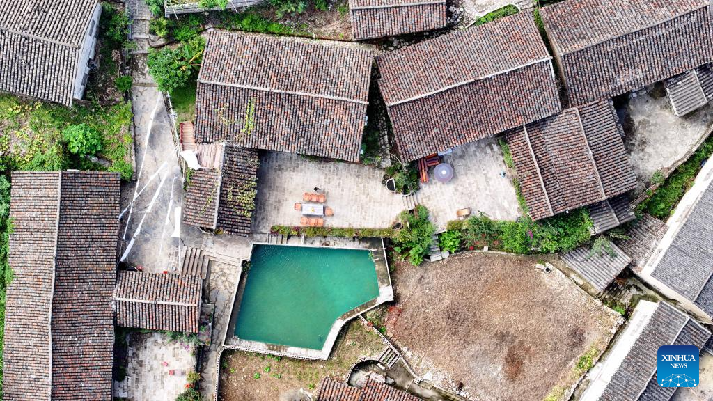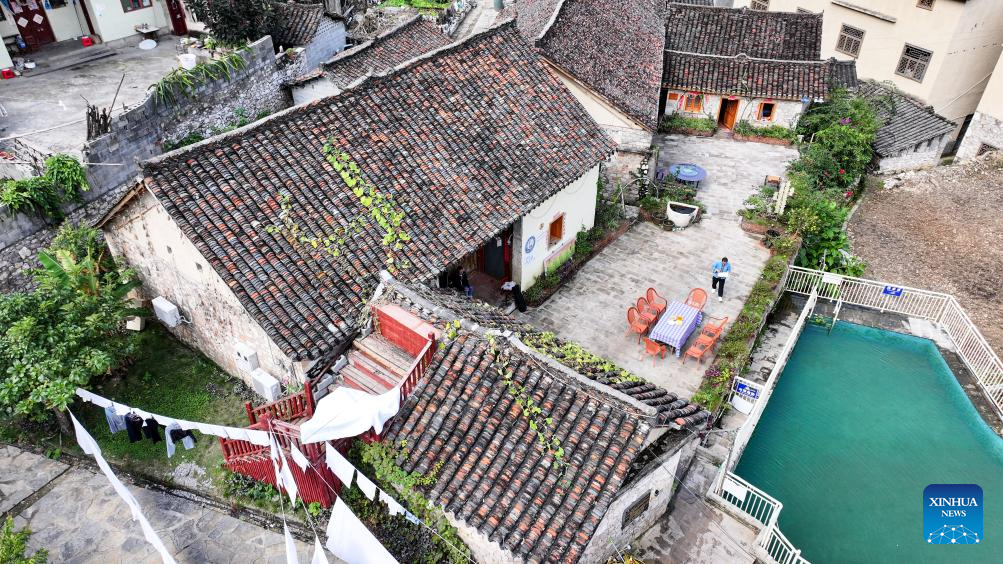 An aerial drone photo shows a homestay at Pingjie Town of Bouyei-Miao Autonomous Prefecture of Qianxinan, southwest China's Guizhou Province, Nov. 6, 2025. The Huajiang Grand Canyon Bridge, soaring 625 meters above the Beipan River in Guizhou's mountainous terrain, is the world's highest bridge. The mega-project is also helping boost tourism in the nearby Pingjie Town, which has benefited from the improved traffic condition. (Xinhua/Ou Dongqu)