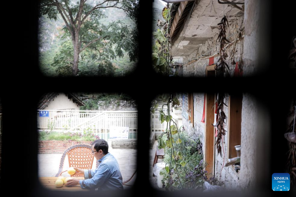 An owner of a homestay prepare fruits at Pingjie Town of Bouyei-Miao Autonomous Prefecture of Qianxinan, southwest China's Guizhou Province, Nov. 6, 2025. The Huajiang Grand Canyon Bridge, soaring 625 meters above the Beipan River in Guizhou's mountainous terrain, is the world's highest bridge. The mega-project is also helping boost tourism in the nearby Pingjie Town, which has benefited from the improved traffic condition. (Xinhua/Ou Dongqu)