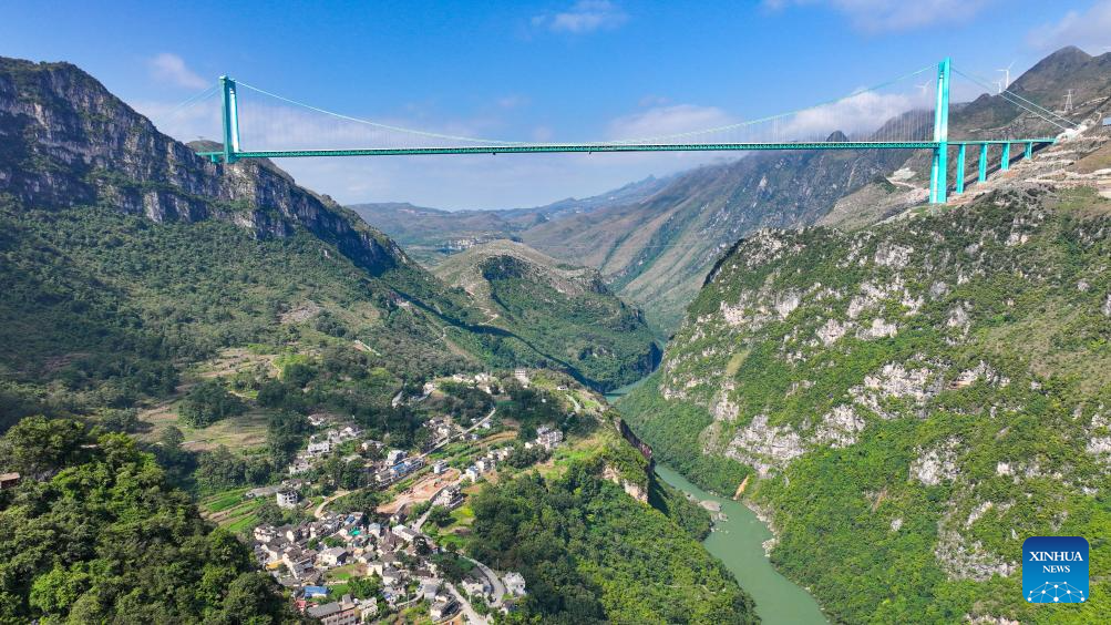 An aerial drone photo shows the Huajiang Grand Canyon Bridge and the Pingjie Town of Bouyei-Miao Autonomous Prefecture of Qianxinan, southwest China's Guizhou Province, Nov. 6, 2025. The Huajiang Grand Canyon Bridge, soaring 625 meters above the Beipan River in Guizhou's mountainous terrain, is the world's highest bridge. The mega-project is also helping boost tourism in the nearby Pingjie Town, which has benefited from the improved traffic condition. (Xinhua/Ou Dongqu)