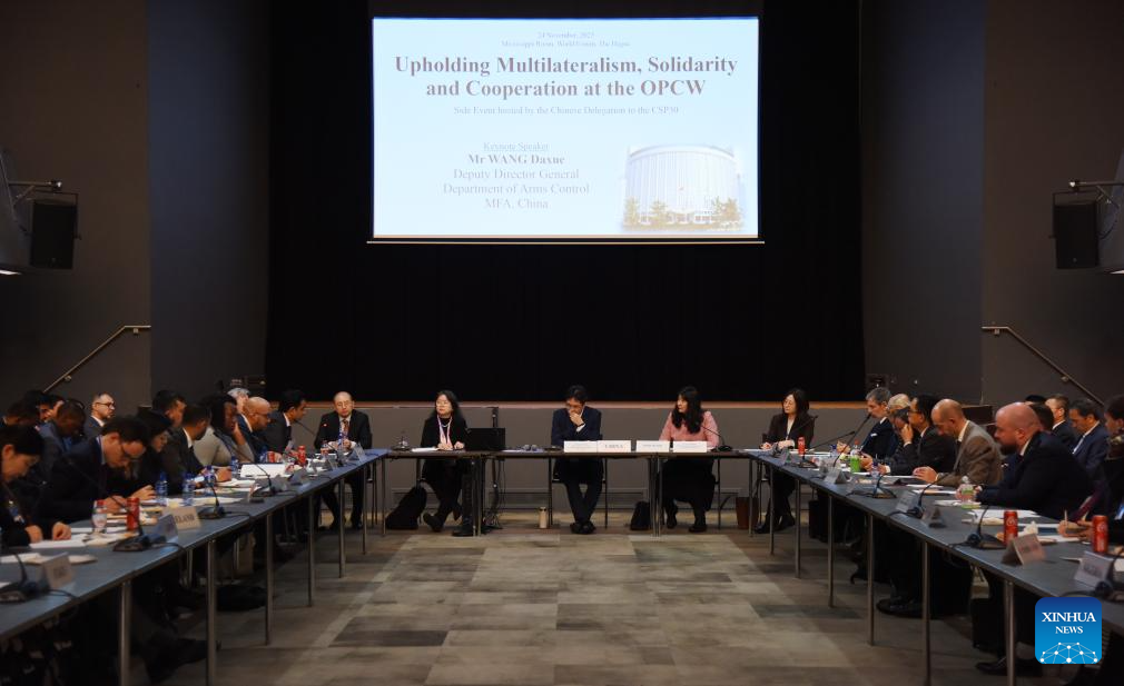 This photo taken on Nov. 24, 2025 shows a side event hosted by the Chinese delegation to the 30th session of the Conference of the States Parties to the Chemical Weapons Convention (CSP-30) in the Hague, the Netherlands. The CSP-30 opened here on Monday. China has appealed to all states parties of the Organization for the Prohibition of Chemical Weapons (OPCW) to advance true multilateralism and enhance solidarity and cooperation. (Xinhua)