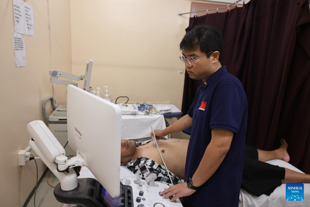 A doctor from the sixth batch of the Chinese medical team to Tonga performs an examination for Aisea Latu Talia'uli in Nuku'alofa, Tonga on Nov. 8, 2025. (The sixth batch of the Chinese medical team to Tonga /Handout via Xinhua)