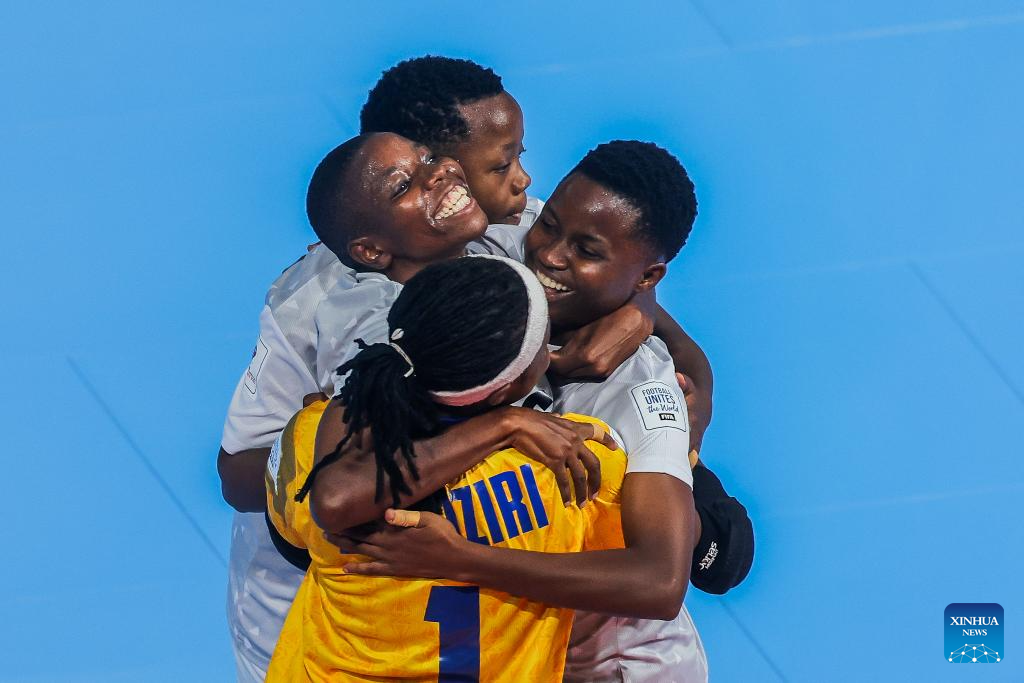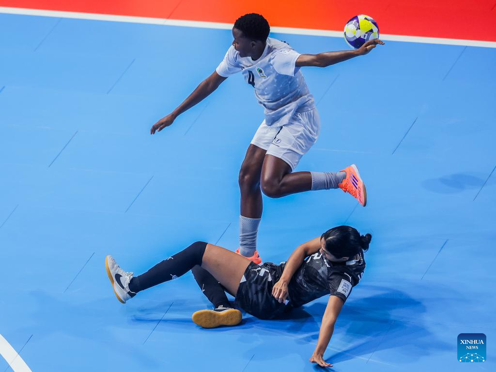 Players of Tanzania celebrate after scoring a goal during the group C match between New Zealand and Tanzania at the FIFA Futsal Women's World Cup 2025 in Pasig City, the Philippines, Nov. 26, 2025. (Xinhua/Rouelle Umali)