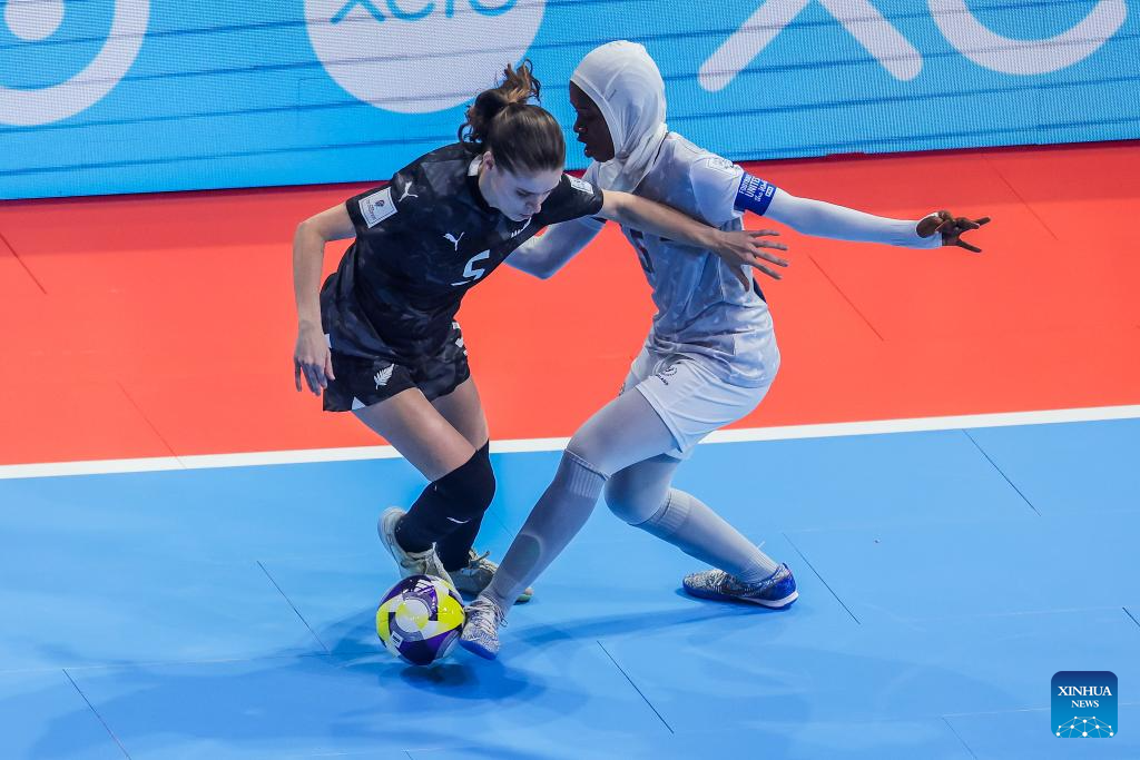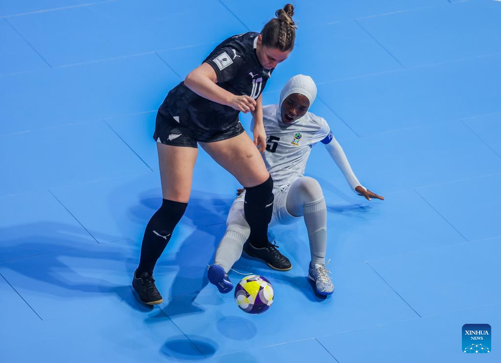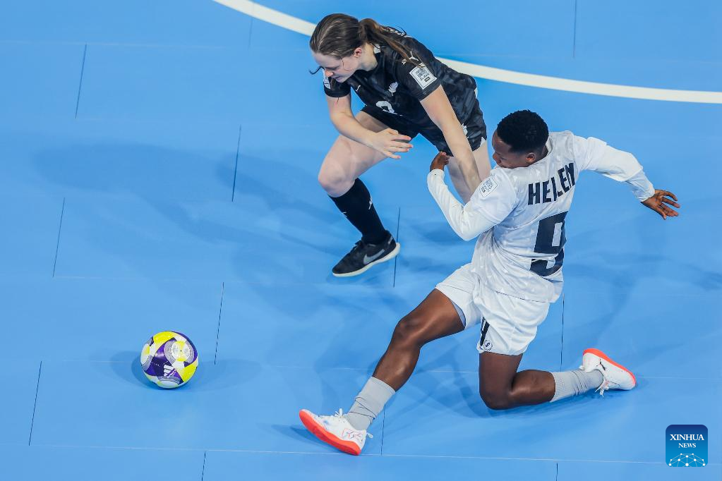 Fatuma Issa (R) of Tanzania competes against Sophie Williams (L) of New Zealand during the group C match between New Zealand and Tanzania at the FIFA Futsal Women's World Cup 2025 in Pasig City, the Philippines, Nov. 26, 2025. (Xinhua/Rouelle Umali)