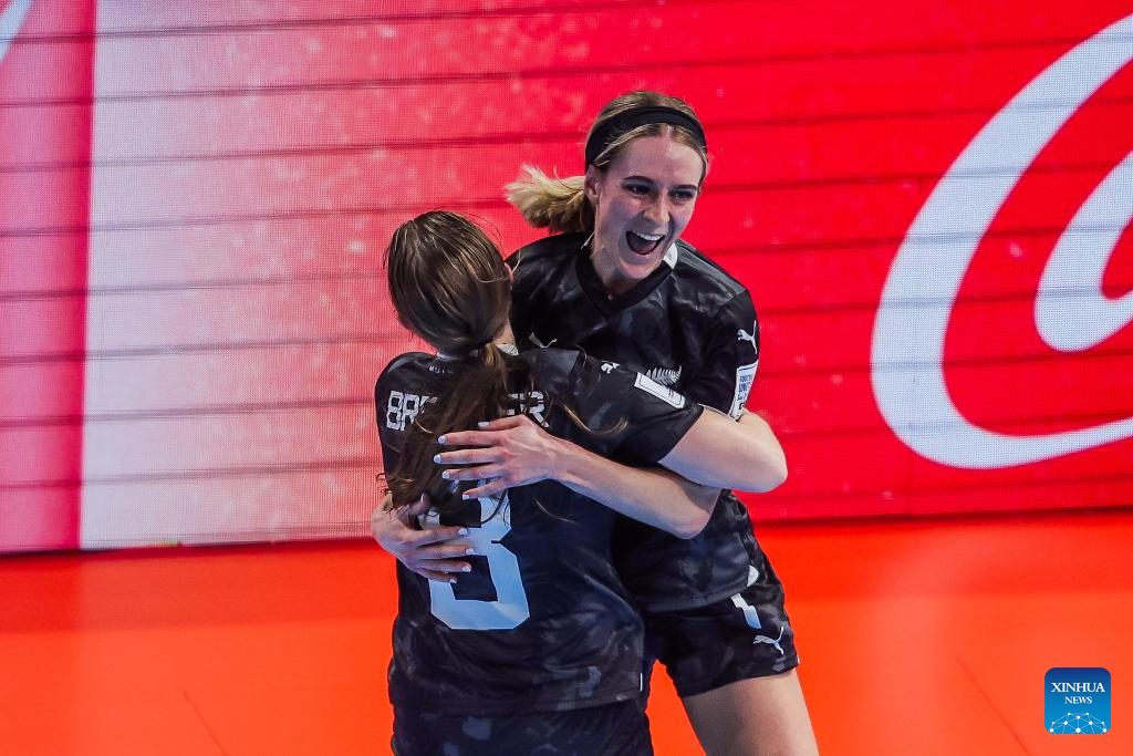 Players of New Zealand celebrate after scoring a goal during the group C match between New Zealand and Tanzania at the FIFA Futsal Women's World Cup 2025 in Pasig City, the Philippines, Nov. 26, 2025. (Xinhua/Rouelle Umali)