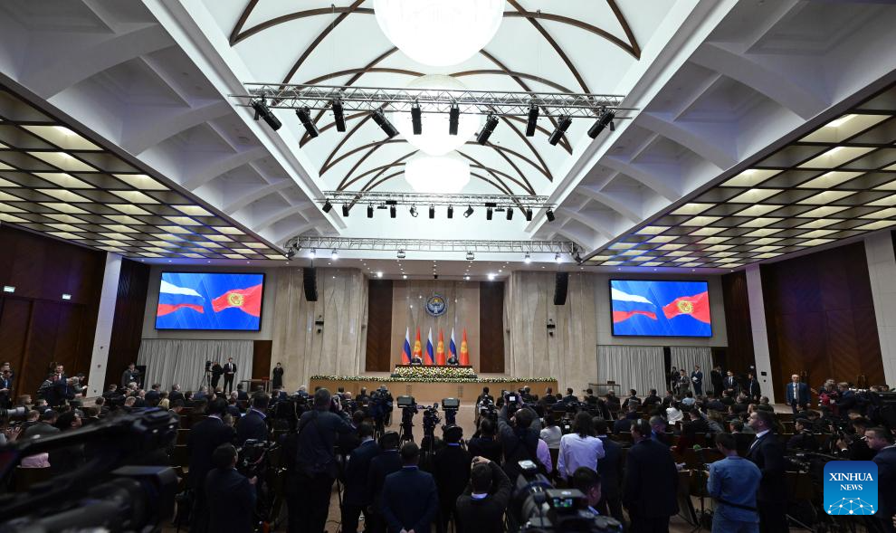 Russian President Vladimir Putin and Kyrgyz President Sadyr Japarov attend a joint press conference in Bishkek, Kyrgyzstan, Nov. 26, 2025. Kyrgyz President Sadyr Japarov and Russian President Vladimir Putin held talks here on Wednesday, after which both leaders issued statements highlighting cooperation in trade and investment. (Office of the President of the Kyrgyz Republic/Handout via Xinhua)
