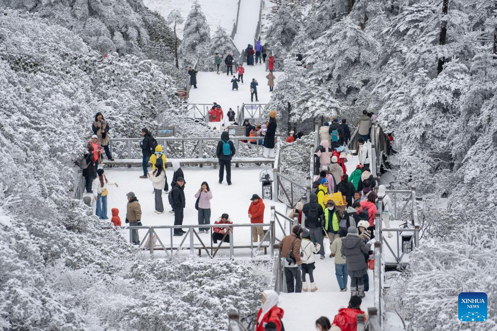 Visitors enjoy ice and snow scenery on Cangshan Mountain in Dali, southwest China's Yunnan Province, Nov. 24, 2025. Cangshan Mountain greeted the first snowfall of this winter. (Photo by Luo Zhu/Xinhua)