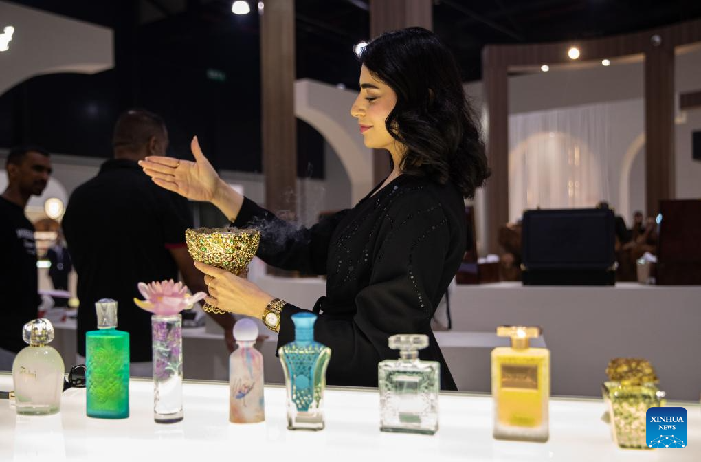 An exhibitor showcases Arabian incense at the "Scent Arabia" exhibition in Manama, Bahrain, Nov. 25, 2025. The "Scent Arabia" exhibition opened at Exhibition World Bahrain in Manama on Tuesday, featuring over 100 brands from the Gulf countries and worldwide, including perfumes, home fragrances and Arabian incense. The event is scheduled to run through Nov. 29. (Xinhua/Chen Junqing)