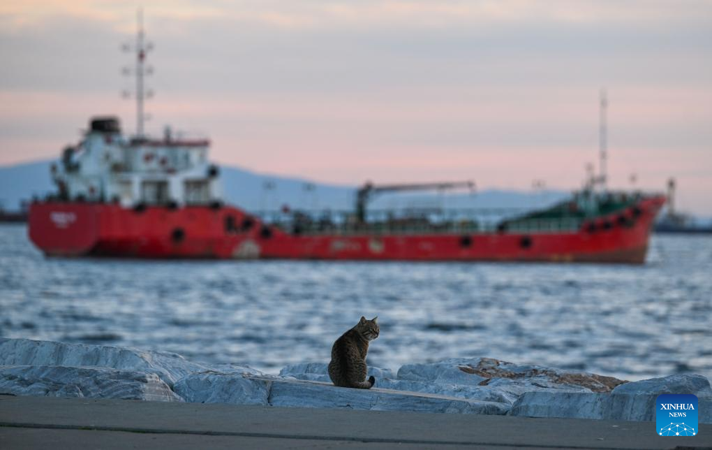 A cat rests along the Marmara Sea coast, with a ship moored on the water nearby, in Istanbul, Türkiye, Nov. 25, 2025. The Marmara Sea is an inland sea connecting the Black Sea and the Aegean Sea via the Bosphorus and Dardanelles straits. (Xinhua/Liu Lei)