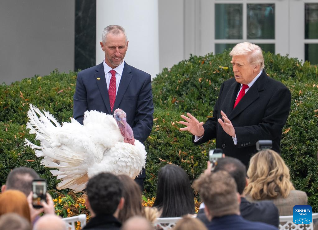 U.S. President Donald Trump (R) attends the National Thanksgiving Turkey Pardoning Ceremony at the White House in Washington, D.C., the United States, Nov. 25, 2025. (Xinhua/Hu Yousong)
