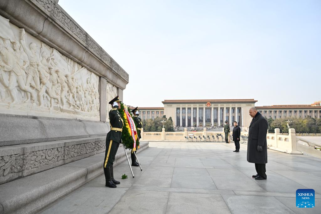 King Tupou VI of the Kingdom of Tonga lays a wreath at the Monument to the People's Heroes on Tian'anmen Square in Beijing, capital of China, Nov. 26, 2025. (Xinhua/Dai Tianfang)