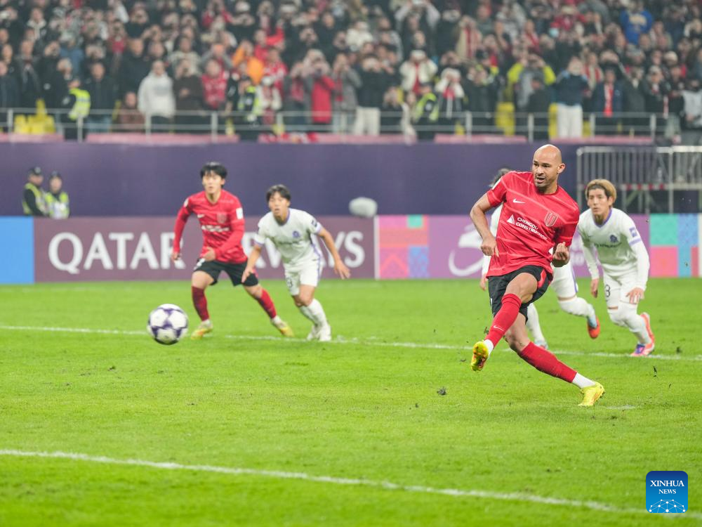Felipe Silva (R, front) of Chengdu Rongcheng takes a penalty kick to score during the round 5 match between Chengdu Rongcheng of China and Sanfrecce Hiroshima of Japan at AFC Champions League Elite in Chengdu, southwest China's Sichuan Province, Nov. 25, 2025. (Xinhua/Wang Xi)