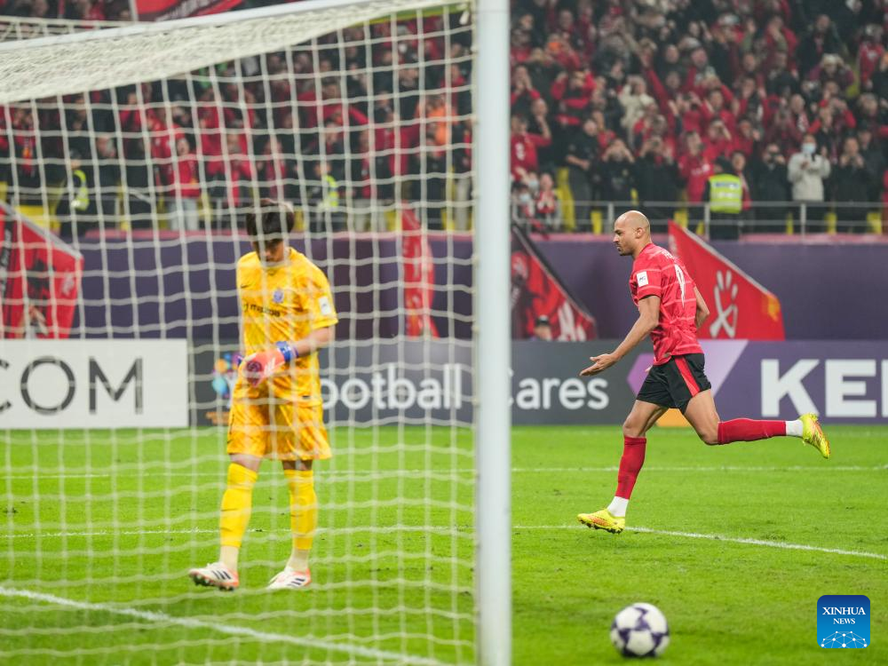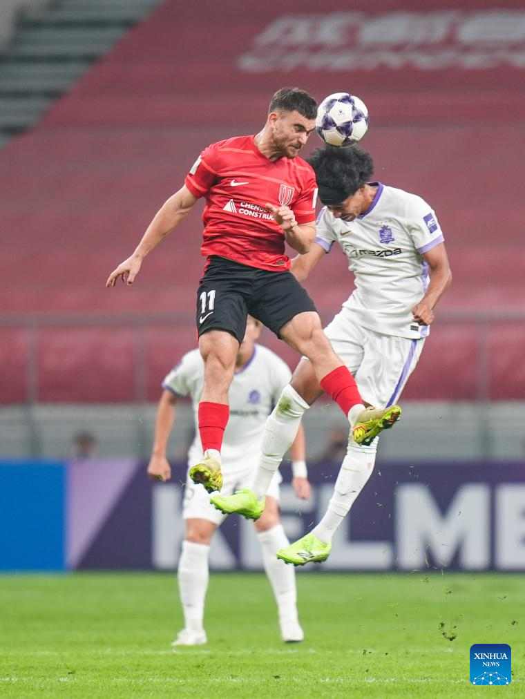Felipe Silva (R) of Chengdu Rongcheng celebrates during the round 5 match between Chengdu Rongcheng of China and Sanfrecce Hiroshima of Japan at AFC Champions League Elite in Chengdu, southwest China's Sichuan Province, Nov. 25, 2025. (Xinhua/Wang Xi)