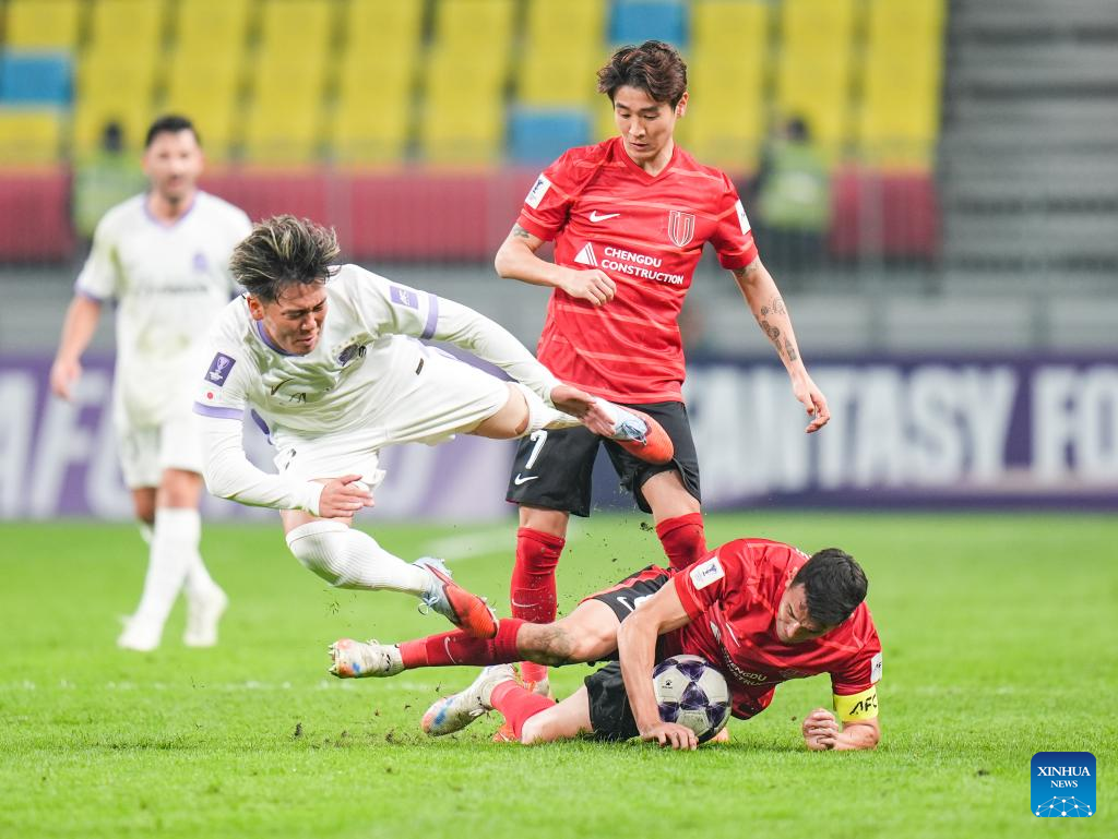 Yamasaki Taichi (L) of Sanfrecce Hiroshima vies with Tim Chow (bottom) of Chengdu Rongcheng during the round 5 match between Chengdu Rongcheng of China and Sanfrecce Hiroshima of Japan at AFC Champions League Elite in Chengdu, southwest China's Sichuan Province, Nov. 25, 2025. (Xinhua/Wang Xi)