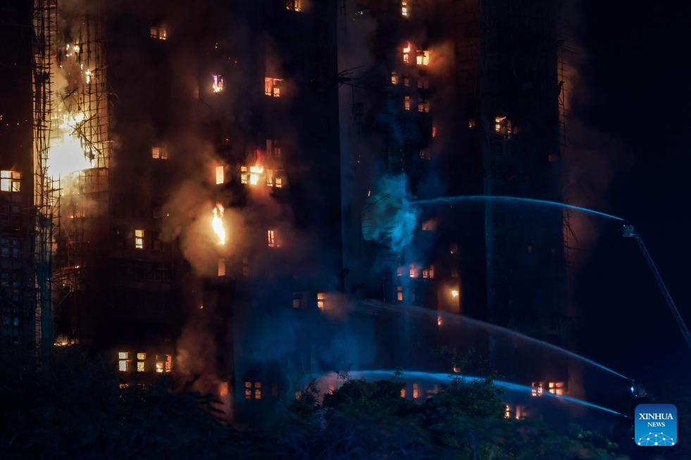 This photo taken on Nov. 26, 2025 shows rescuers working on a residential building fire site in Hong Kong, south China. A fire broke out at a residential building in the Tai Po area of Hong Kong on Wednesday afternoon, leaving four people dead, according to a press release issued by the Hong Kong Special Administrative Region (HKSAR) government. The Fire Services Department of the HKSAR government was notified of the incident at around 2:51 p.m. local time. Due to the fierce blaze, the department raised the alert to a No. 5 alarm fire at 6:22 p.m., which is the highest level in Hong Kong's fire alarm system. (Xinhua/Chen Duo)