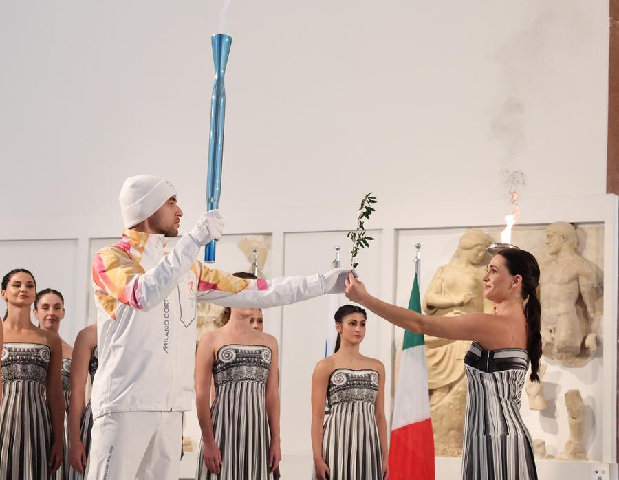 ANCIENT OLYMPIA, Greece, Nov. 26 (Xinhua) -- The Olympic flame for the 2026 Milan-Cortina Winter Olympics was ignited Wednesday at the historic site of Ancient Olympia, marking the start of its journey to Italy.