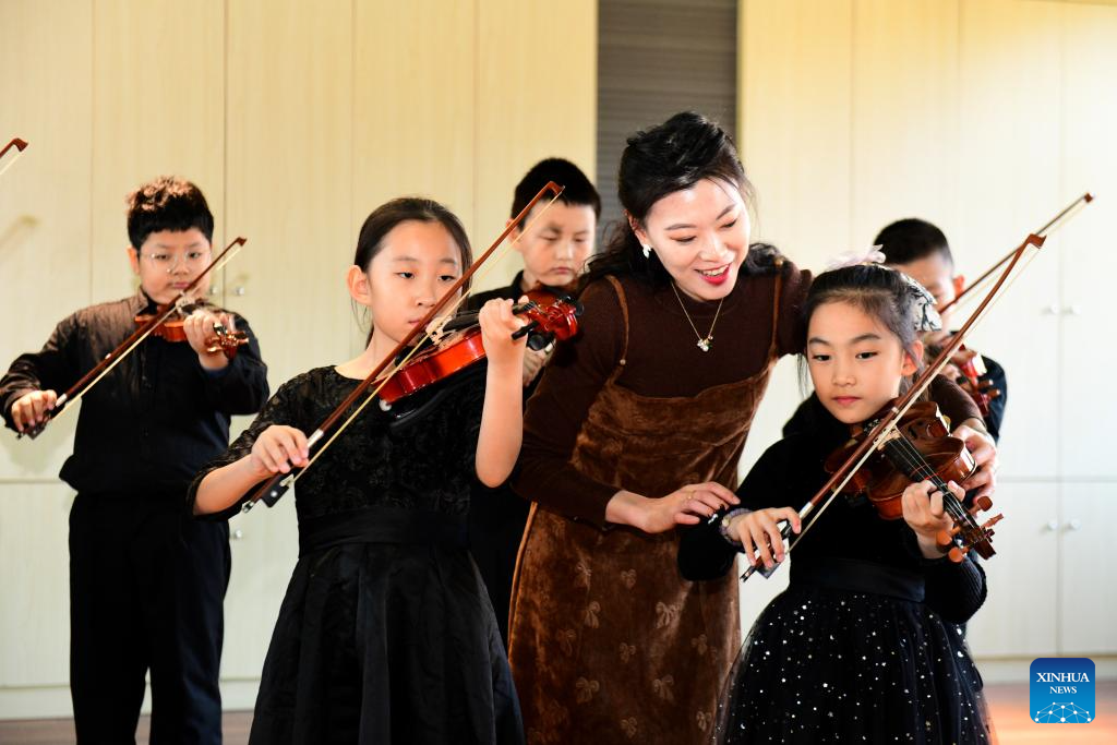 A teacher guides students in practicing violin at a primary school in Shizhong District of Jinan City, east China's Shandong Province, Nov. 26, 2025. In recent years, authorities in Shizhong District of Jinan City have been encouraging local schools to enhance aesthetic education by exposing their students to diverse arts-related extracurricular programs. (Xinhua/Guo Xulei)