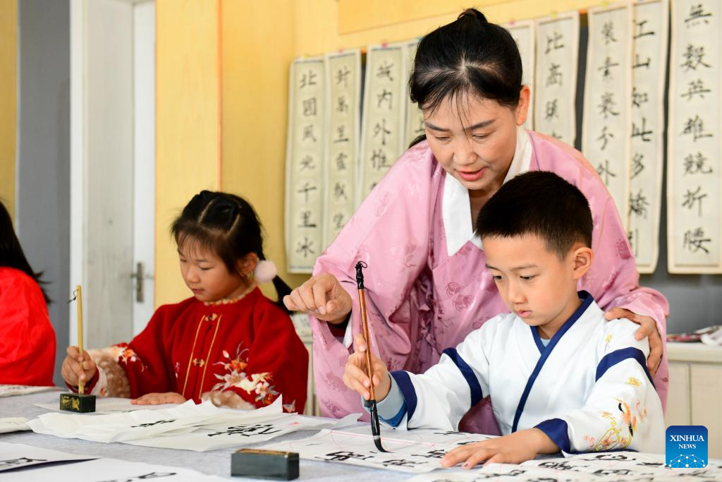 A teacher guides students in practicing calligraphy at a primary school in Shizhong District of Jinan City, east China's Shandong Province, Nov. 26, 2025. In recent years, authorities in Shizhong District of Jinan City have been encouraging local schools to enhance aesthetic education by exposing their students to diverse arts-related extracurricular programs. (Xinhua/Guo Xulei)