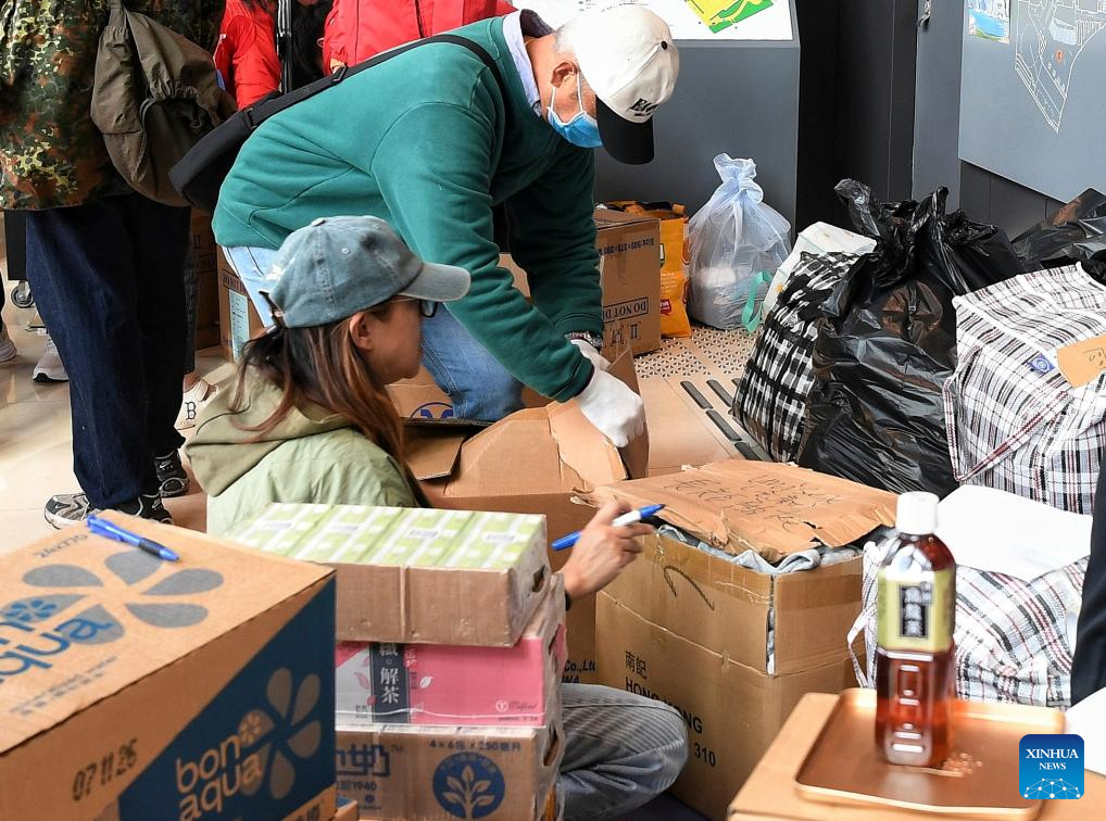 Staff members pack relief materials donated by citizens at a community in Tai Po of Hong Kong, south China, Nov. 27, 2025. Three men have been arrested for suspected manslaughter in a fire that broke out in Wang Fuk Court, a residential area in Tai Po of Hong Kong, on Wednesday afternoon, the Hong Kong Police Force said at a press briefing on Thursday.
