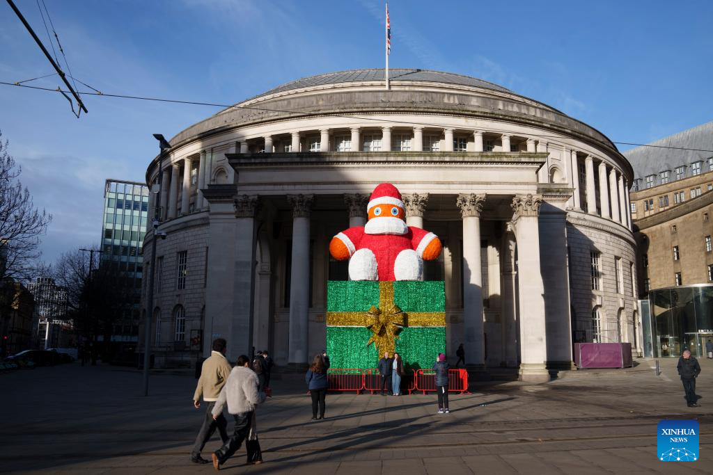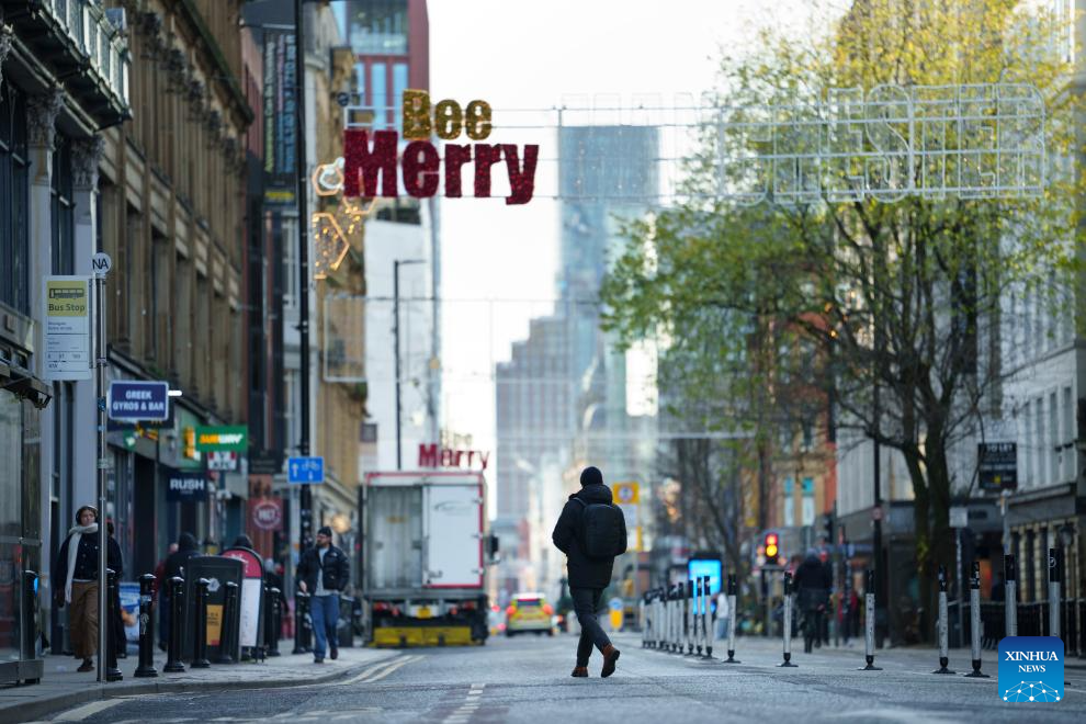 People walk past Christmas decorations in Manchester, Britain, Nov. 26, 2025. British Chancellor of the Exchequer Rachel Reeves unveiled the 2025 Budget on Wednesday, pledging that the government will neither return the country to austerity nor allow public spending and borrowing to spiral, while vowing to ease pressures on the cost of living.
