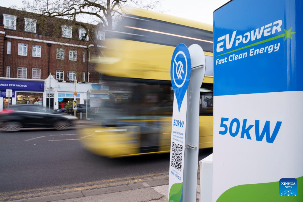 A charging station is seen in Manchester, Britain, Nov. 26, 2025. British Chancellor of the Exchequer Rachel Reeves unveiled the 2025 Budget on Wednesday, pledging that the government will neither return the country to austerity nor allow public spending and borrowing to spiral, while vowing to ease pressures on the cost of living.