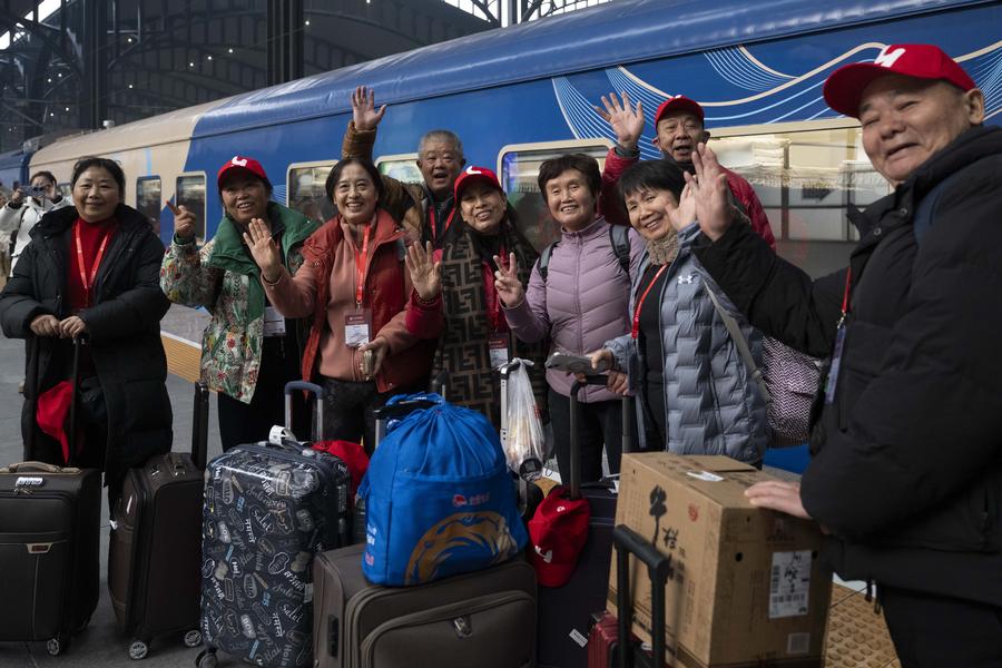 HARBIN, Nov. 27 (Xinhua) -- Train Y783, an ice-and-snow themed tourism train, was launched at Harbin Railway Station in northeast China's Heilongjiang Province and started a six-day trip on Wednesday. The train showcases the charm of northeastern China through themed decorations, tour guide services and interactive activities, in an effort to promote winter tourism and inject new vitality into ice and snow economy.