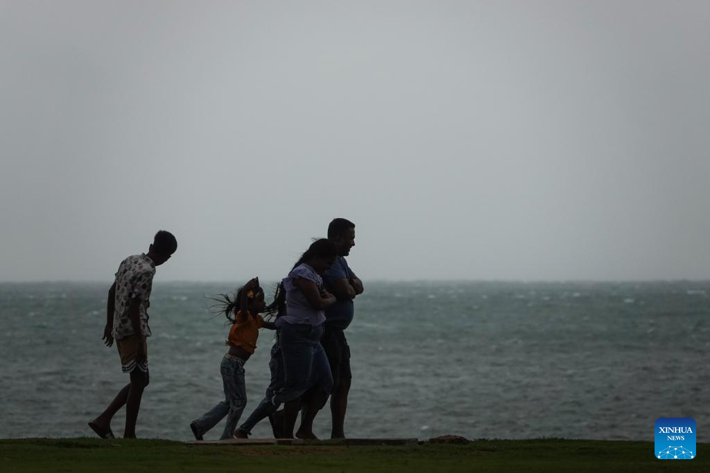 A family walks through strong winds in Colombo, Sri Lanka, Nov. 27, 2025. Sri Lanka is confronting one of its most severe weather disasters in recent years, as days of heavy rainfall and multiple landslides have killed 31 people, left 14 missing, and displaced thousands across the island, the Disaster Management Center (DMC) said on Thursday. Sri Lanka's Department of Meteorology on Thursday issued a red alert for both land and surrounding sea areas as the deep depression that had formed near the Sri Lankan coast in the Bay of Bengal has intensified into a cyclone, now named "Ditwah." Officials warned that heavy rains, strong winds, and hazardous sea conditions are expected to persist across the island over the coming days as the system advances. (Photo by Thilina Kaluthotage/Xinhua)