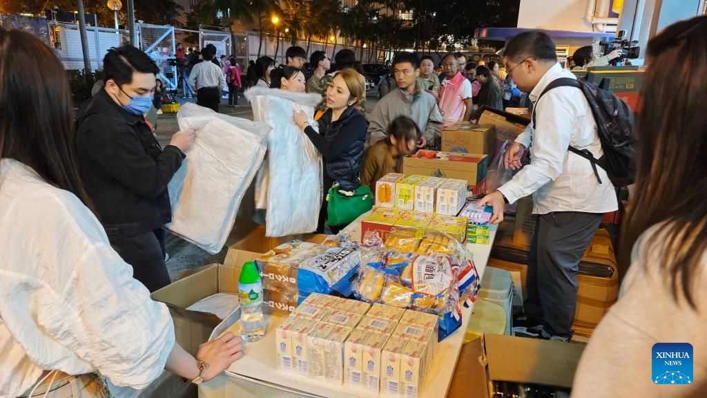 Residents affected by a residential area fire receive relief supplies at a relief station in Hong Kong, south China, Nov. 26, 2025. A huge fire engulfed a residential area in Tai Po, Hong Kong on Wednesday afternoon, which had left 44 dead and 45 injured by early Thursday morning. Rescue operations were still underway. (Xinhua/Chen Duo)