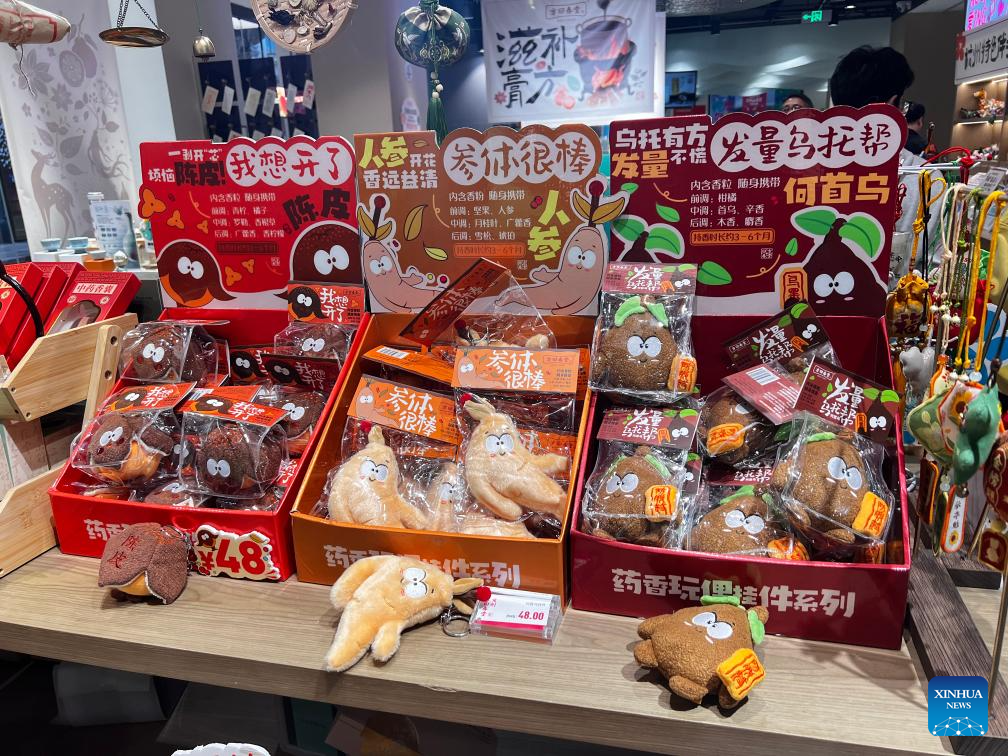 Cultural and creative products themed on traditional Chinese medicine (TCM) are pictured at a store in the Fang Hui Chun Tang TCM clinic in Hangzhou, east China's Zhejiang Province, Nov. 4, 2025. (Xinhua/Ji Hang)