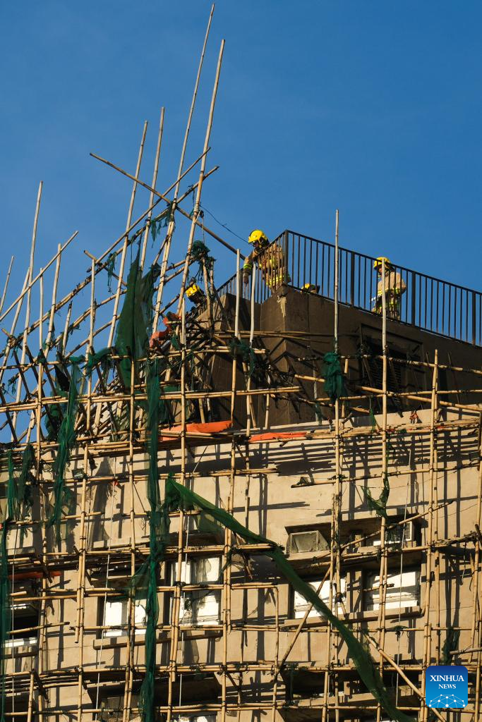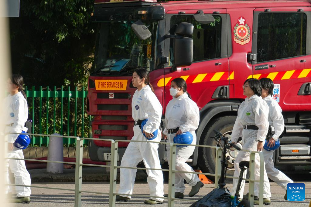 Firefighters work after a fire on the rooftop of a building of Wang Fuk Court, a residential area in Tai Po of Hong Kong, south China, Nov. 28, 2025. Hong Kong Police Force will conduct full evidence collection and investigation into the Wang Fuk Court fire in Tai Po, which is expected to take three to four weeks, Chris Tang Ping-keung, secretary for security of the Hong Kong Special Administrative Region government, told a press conference on Friday. (Xinhua/Zhu Wei)
