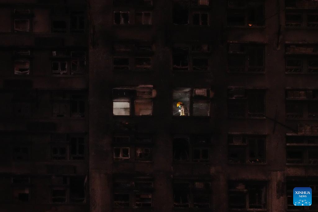 A firefighter works after a fire in Wang Fuk Court, a residential area in Tai Po of Hong Kong, south China, Nov. 28, 2025. Hong Kong Police Force will conduct full evidence collection and investigation into the Wang Fuk Court fire in Tai Po, which is expected to take three to four weeks, Chris Tang Ping-keung, secretary for security of the Hong Kong Special Administrative Region government, told a press conference on Friday. (Xinhua/Zhu Wei)