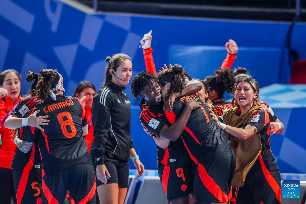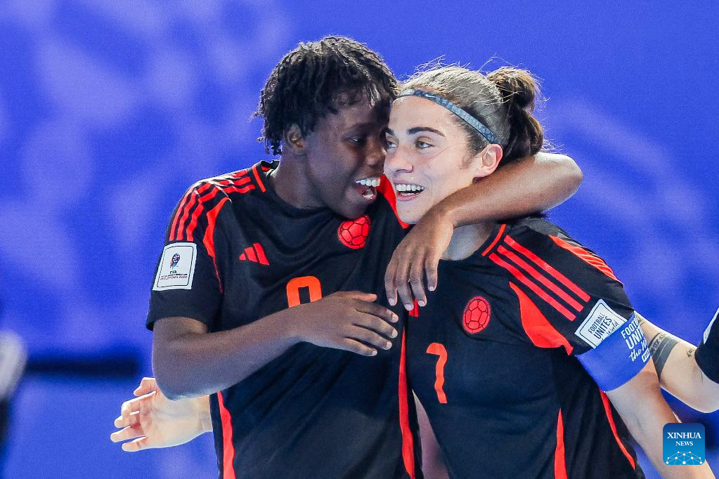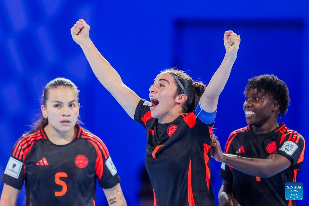Players of Colombia celebrate after scoring a goal during the group B match between Colombia and Thailand at the FIFA Futsal Women's World Cup 2025 in Pasig City, the Philippines on Nov. 28, 2025. (Xinhua/Rouelle Umali)