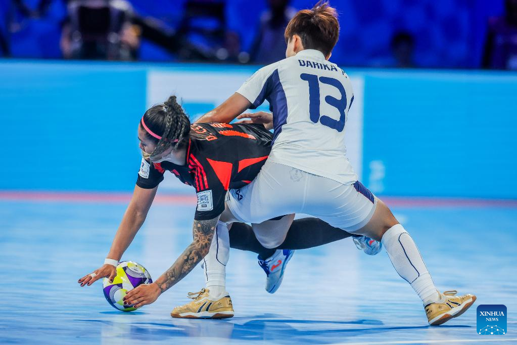 Diana Celis (Back) of Colombia competes against Darika Peanpailun (Front) of Thailand during the group B match at the FIFA Futsal Women's World Cup 2025 in Pasig City, the Philippines on Nov. 28, 2025. (Xinhua/Rouelle Umali)