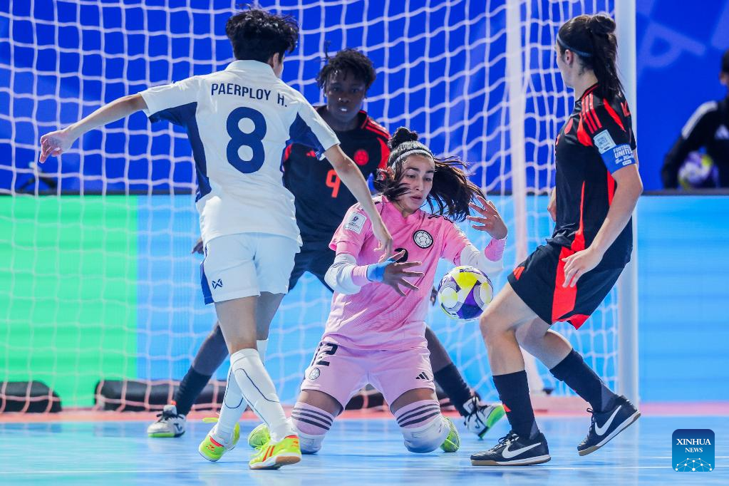 Goalkeeper Allison Olave (C, front) and Merlin Salcedo (R) of Colombia compete against Paerploy Huajaipetch (L) of Thailand during the group B match between Colombia and Thailand at the FIFA Futsal Women's World Cup 2025 in Pasig City, the Philippines on Nov. 28, 2025. (Xinhua/Rouelle Umali)