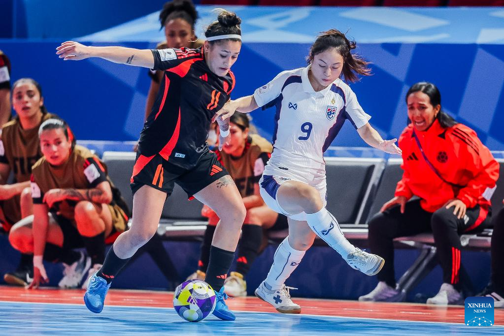 Dayana Rivera (front L) of Colombia competes against Arriya Saetoen (front R) of Thailand during the group B match at the FIFA Futsal Women's World Cup 2025 in Pasig City, the Philippines on Nov. 28, 2025. (Xinhua/Rouelle Umali)