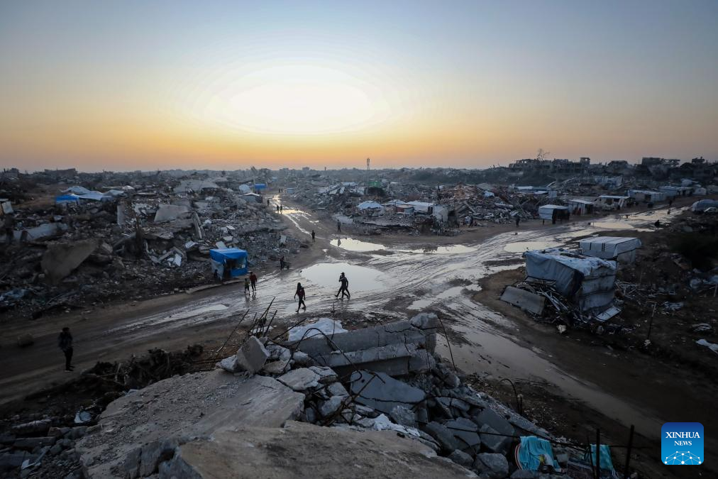 People walk among rubbles in the Zeitoun neighborhood, southeast of Gaza City, Nov. 27, 2025. (Photo by Rizek Abdeljawad/Xinhua)