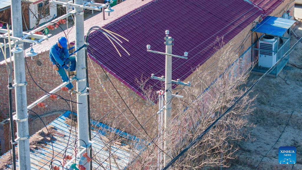 A worker carries out "coal-to-electricity" installation work in Hantianling Village of Tongxin County, Wuzhong City, northwest China's Ningxia Hui Autonomous Region, Nov. 27, 2025. Located in the arid central region of Ningxia, Tongxin County has enabled 28,000 rural households to switch to clean heating through a rural clean heating renovation program and a supporting "coal-to-electricity" project. (Xinhua/Yang Zhisen)