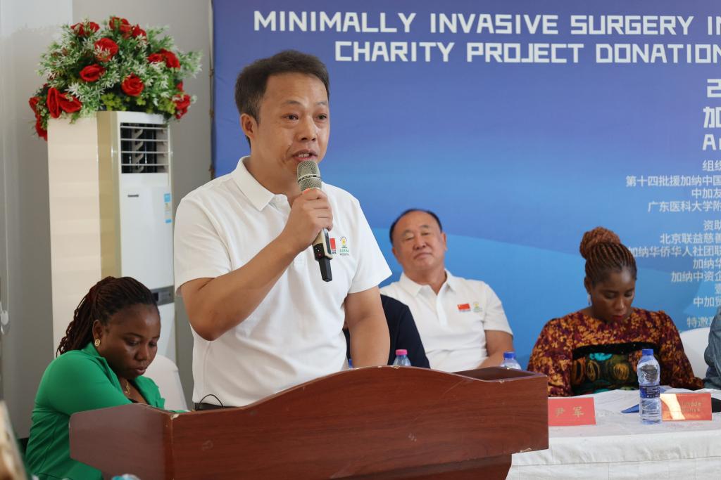 Yang Yongguang, head of the 14th batch of the Chinese medical team to Ghana, speaks at the renewal ceremony for a charity project between the Chinese medical team to Ghana and Lekma Hospital in Accra, Ghana, Nov. 27, 2025. The Chinese medical team to Ghana, with the support of some Chinese enterprises and charity organizations, on Thursday renewed its charity project to provide free surgical treatment at Lekma Hospital in Accra, the national capital.(Photo by Seth/Xinhua)