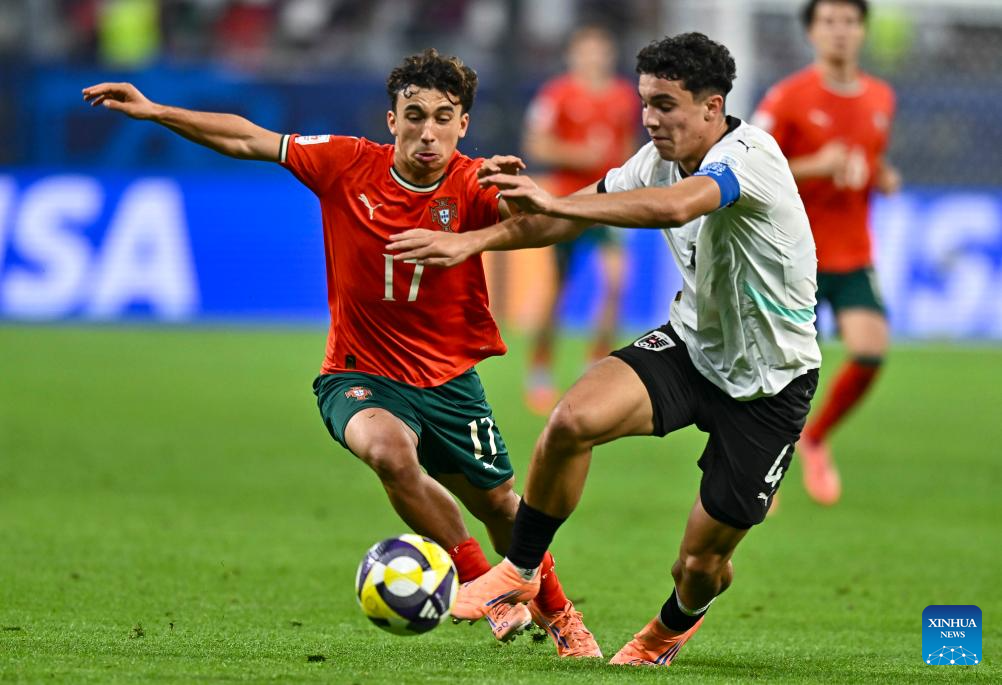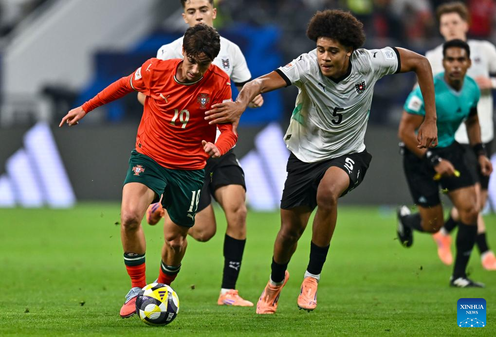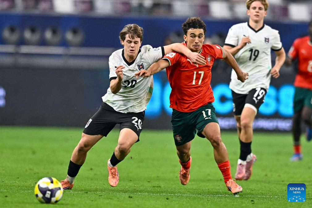 Tomas Soares (L) of Portugal vies with Ifeanyi Arthur Ndukwe of Austria during the final match between Portugal and Austria at the FIFA U17 World Cup Qatar 2025 in Doha, Qatar, Nov. 27, 2025. Portugal won 1-0. (Photo by Nikku/Xinhua)